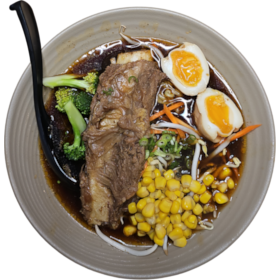 A robust beef bone broth served with a generous portion of tender beef rib, complemented by perfectly soft-boiled marinated egg, fresh broccoli, sweet corn kernels, and finely chopped scallions. A hearty and satisfying choice for beef lovers.
