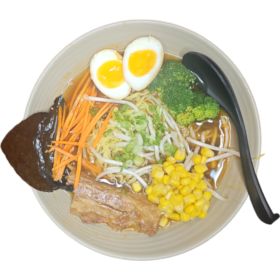 Rich and creamy pork broth served with succulent Japanese-style pork belly, a perfectly soft-boiled marinated egg, and a medley of traditional garnishes. A classic comfort dish with deep flavors.