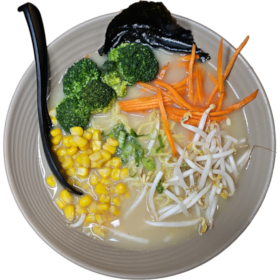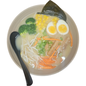 Savory pork bone broth brimming with bean sprouts, tender broccoli, sweet corn kernels, finely chopped scallions, and julienned carrots.